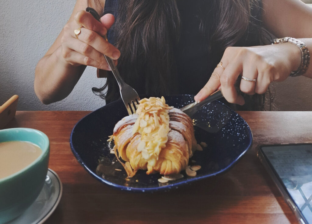 Daí a Adilene também havia pedido para mandarem café e um hyper croissant de avelã laminada com chocolate branco. Dá uma olhada no tamanho do prato da Jéssica hahahah