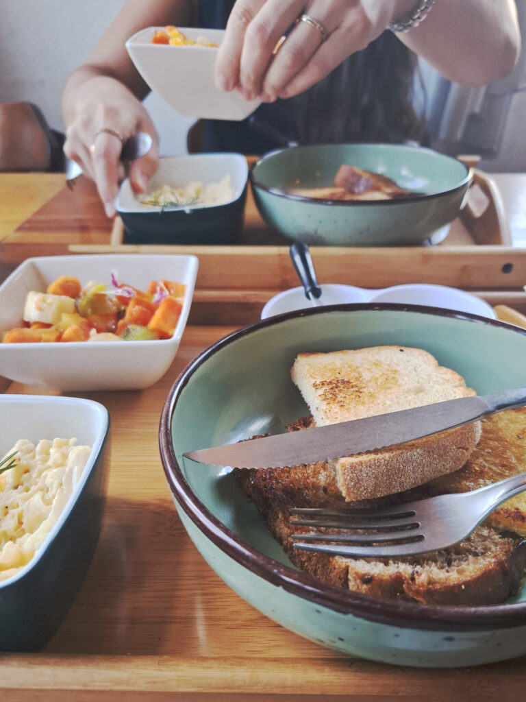 Tinha ovos mexidos, pão na chapa com manteiga, pão de 7 grãos e um pratinho com manteiga e geleia de frutas vermelhas. Estava uma delícia e olha que eu nem sou muito fã de ovos mexidos.